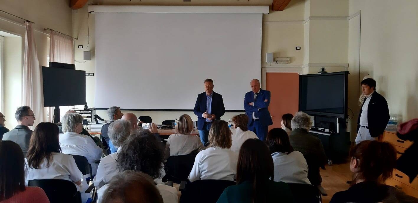 «Siamo qui per presentare il nuovo direttore dell’Unità operativa di ortopedia e traumatologia, Fabrizio Cont e, anche se tutti ormai lo conoscono, il dottor Andrea Ziglio che ricoprirà stabilmente l’incarico di direttore medico di questo ospedale – ha esordito il direttore generale di Apss Antonio Ferro –. Due giovani e motivati professionisti che sono sicuro riusciranno a dare impulso all’attività del presidio ospedaliero di Tione. Lato attività ortopedica, il mandato è quello di continuare, sul solco tracciato dal dottor Antonio Musetti, ad aumentare il numero e la complessità degli interventi ortopedici al fine di evitare trasferimenti negli ospedali di Trento o di Rovereto di pazienti fragili e dei numerosi turisti che, in inverno ed estate affollano queste valli, nell’ottica di un presidio territoriale sempre più vicino ai cittadini. Mi preme evidenziare – ha concluso Ferro – come queste due nomine sono la dimostrazione del continuo impegno di Apss nel reclutamento delle risorse umane per potenziare la sanità di prossimità e per essere sempre più attrattivi per i professionisti. Sono sicuro che la Scuola di medicina darà nuovo impulso a questo ospedale e a tutti gli altri presidi rendendoli maggiormente attrattivi considerato che ricerca e formazione saranno sviluppate in tutte le sedi territoriali».