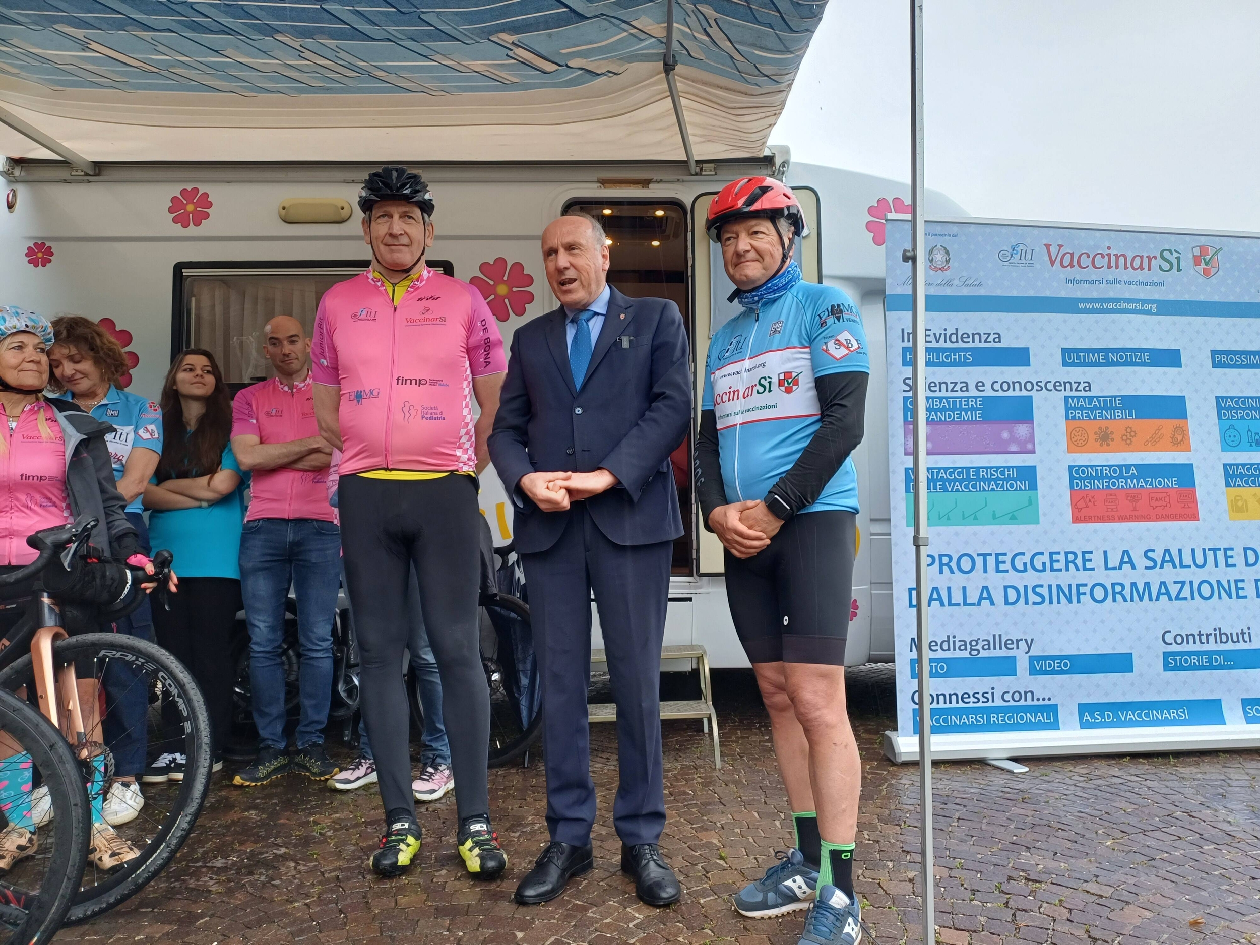 «Ho accettato volentieri l’invito a essere qui oggi – ha dichiarato l'assessore Tonina – per unirmi agli sportivi che, in occasione della tappa del Giro d'Italia che arriverà a San Valentino, vogliono portare il messaggio dell’importanza della prevenzione attraverso vaccinazioni e sani stili di vita. Dobbiamo essere tutti convinti dell’importanza delle vaccinazioni, ce lo ricorda in modo particolare il periodo del Covid, dal quale siamo riusciti a uscire anche grazie a questo importante strumento di prevenzione. L’iniziativa di oggi si allinea perfettamente con la nostra visione di un Trentino attivo e sano, dove prevenzione e stili di vita salutari sono fondamentali per il benessere della nostra comunità».
